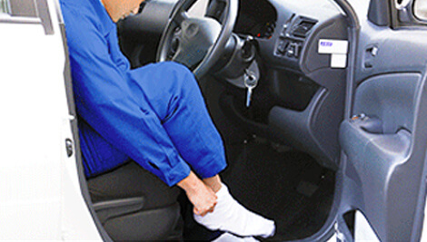 水まわりサポートセンターのスタッフは、お客のご自宅や店舗にお伺いする前に、清潔な靴下に履き替えて作業します。さらに作業中もお客様が快適に過ごせるよう、口臭・体臭予防にも気遣っています。
